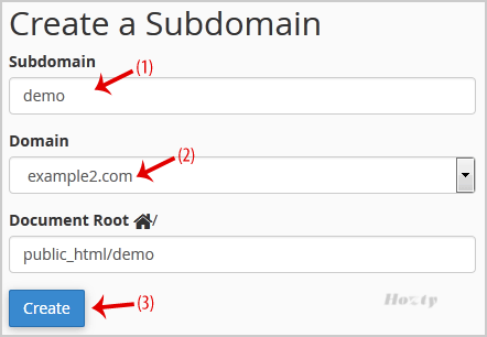 3. Under "Create a Subdomain" in the "Subdomain" field you should enter your subdomain name like "demo"(without quota) and should you have a number of domains, select the appropriate domain from the dropdown list.